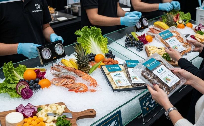 まず第一に、温度管理が最も重要です。生鮮食品は「コールドチェーン」を意識し、運搬時から提供まで一貫して適温を保ちましょう。業務用クーラーボックスやドライアイスの活用が効果的で、サーモスやイグルーなどの高性能保冷容器は長時間の温度維持に優れています。
